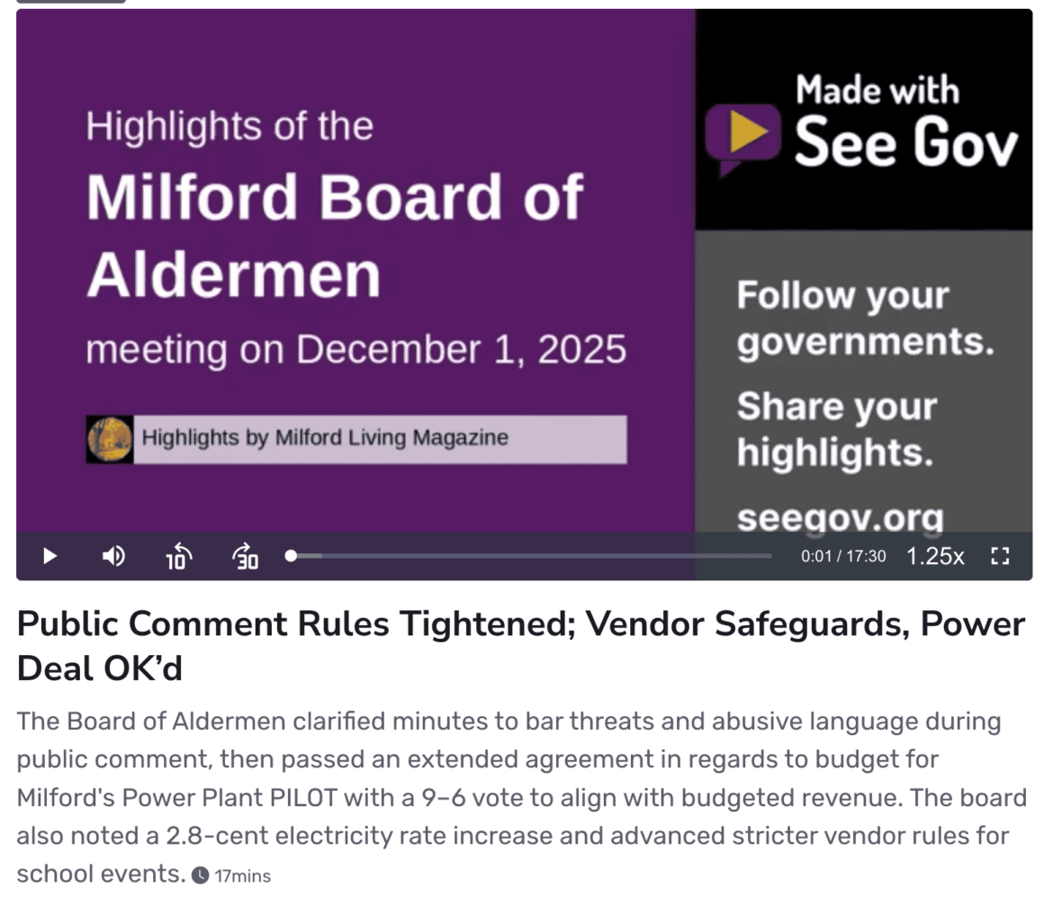 The Board of Aldermen clarified minutes to bar threats and abusive language during public comment, then passed an extended agreement in regards to budget for Milford’s Power Plant PILOT with a 9–6 vote to align with budgeted revenue.