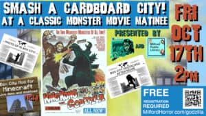 Let out your inner giant monster at this special event that combines a screening of the 1962 classic King Kong vs. Godzilla with a chance to be a titanic monster and destroy a cardboard city. Bring your own monster suit (optional). Milford Horror is teaming up with the Milford Public Library Children’s Department to construct a city out of painted cardboard and other easily crushed materials. Before the movie, guests are invited to explore and take photos in the city. After the screening of the classic Toho monster matchup where Godzilla faces off against King Kong, guests will be invited to pretend they are the monster in a rubber suit and lay waste to the cardboard box city. Photos and slow-motion videos are encouraged!